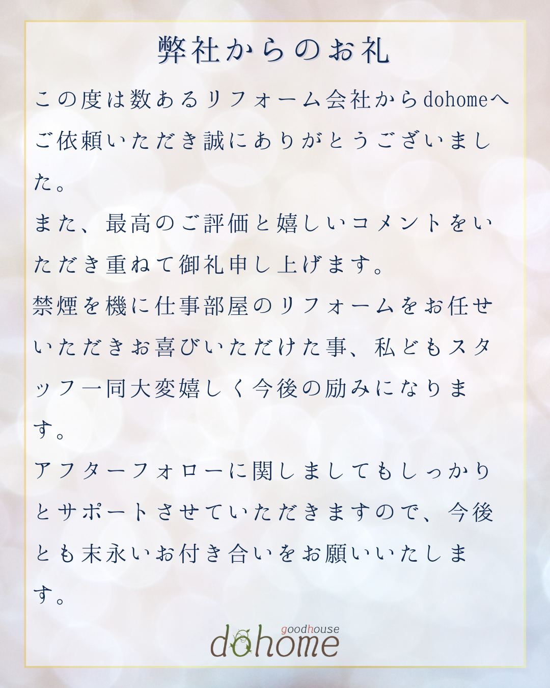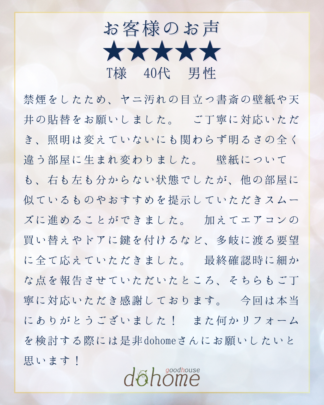 新着情報 NEWS お客様のお声 2026.02.18 お客様からいただいたGoogleクチコミをご紹介いたします。 天井や壁紙の貼替、エアコンの買い替え、鍵の取り付け等のリフォームのご依頼をいただきました。 Googleクチコミが65件達成いたしました! すべてのお客様より★5.0の高評価をいただいております。 多くのお客様にご愛顧いただき、心より感謝申し上げます。 一覧に戻る
