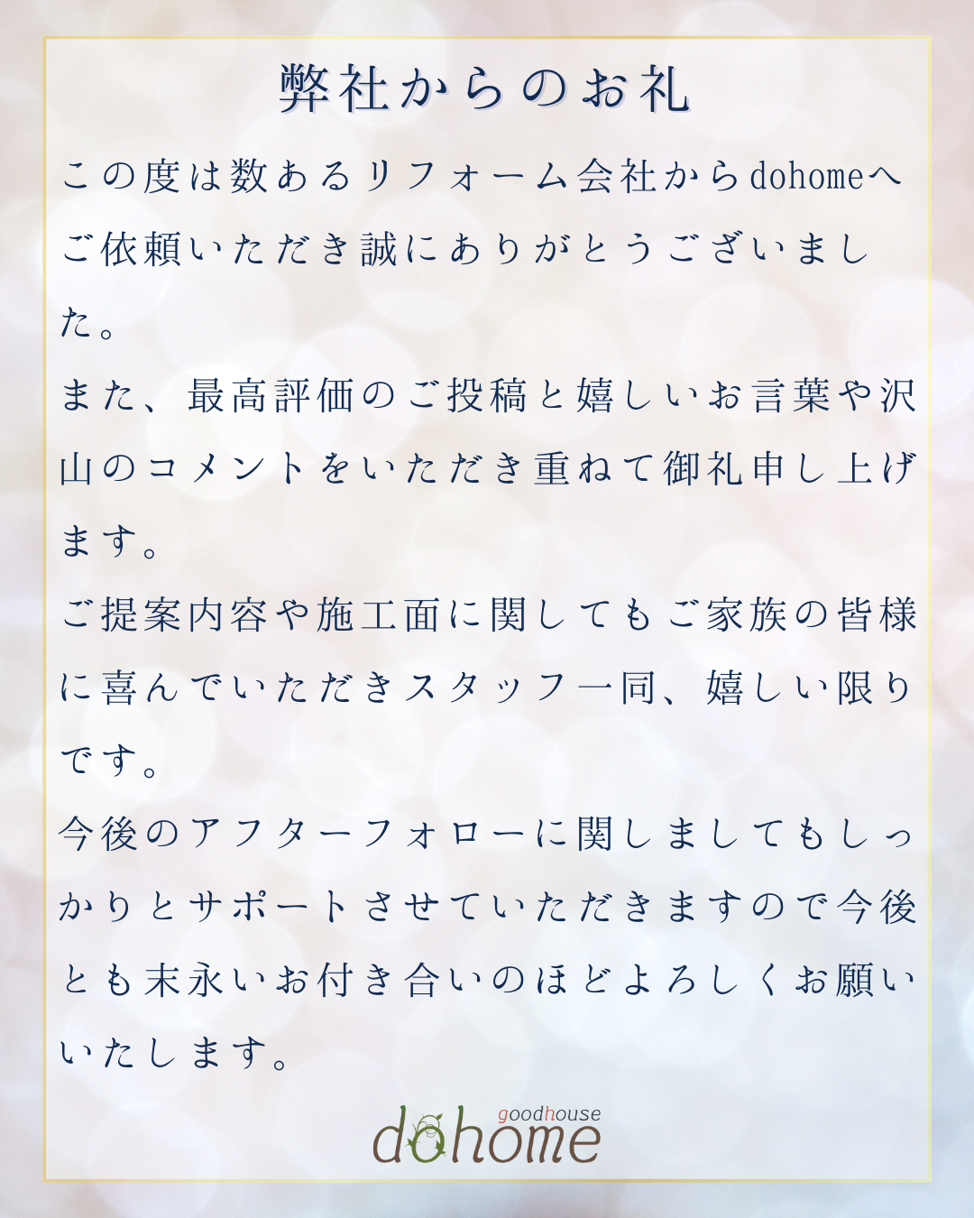 新着情報 NEWS お客様のお声 2026.03.06 お客様からいただいたGoogleクチコミをご紹介いたします。 天井や壁紙の貼替、エアコンの買い替え、鍵の取り付け等のリフォームのご依頼をいただきました。 Googleクチコミが70件達成いたしました! すべてのお客様より★5.0の高評価をいただいております。 多くのお客様にご愛顧いただき、心より感謝申し上げます。 一覧に戻る